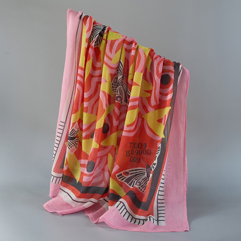 Rött och rosa. Vad vore livet utan dessa underbara färger. Med fantasifulla fjärilar i en växtdjungel, illustrerat av mig. Och med en liten uppmanande text ’Today is a Good Day’. Den är 100% bomull och finns även som Ekologisk bomull. Måttet ca 110 x 110 cm. Och eftersom det är väldigt tunt bomullstyg är det handtvätt som gäller. Scarfen är digitaltryckt.