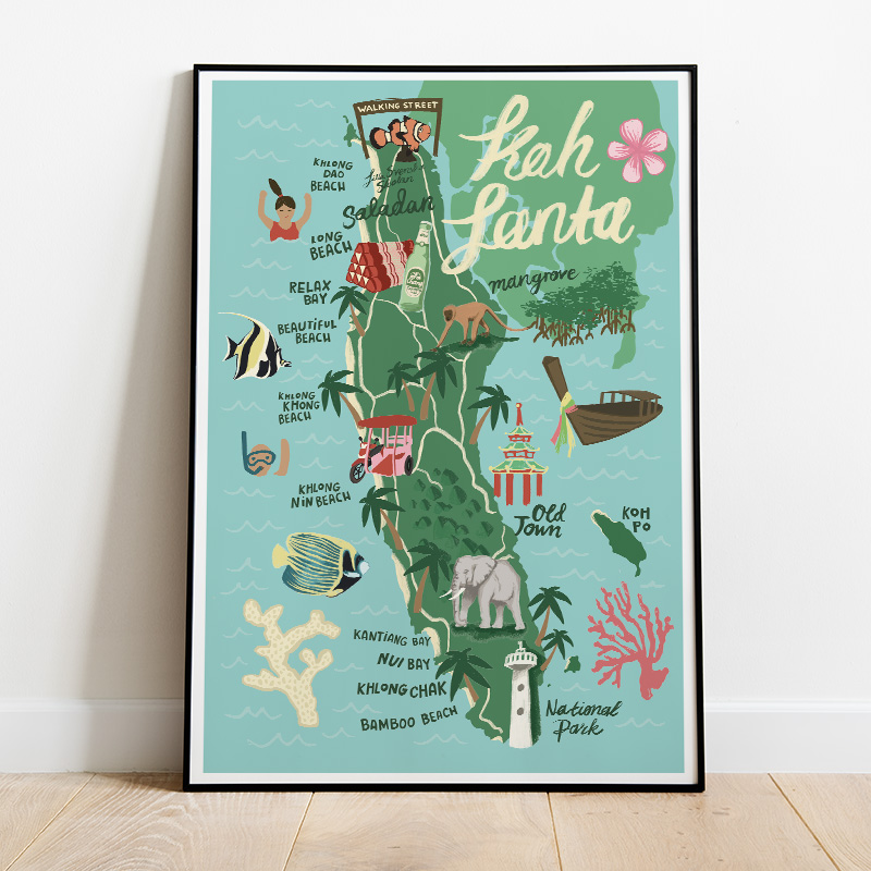 This poster was created by my daughter Stella. In 2026 she is on Koh Lanta in Thailand, and to finance her living, the creative brain started working. The result was an illustrated map of the island – filled with that calm, warm and slightly magical feeling that only Koh Lanta has.